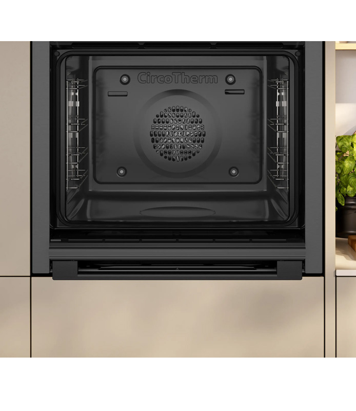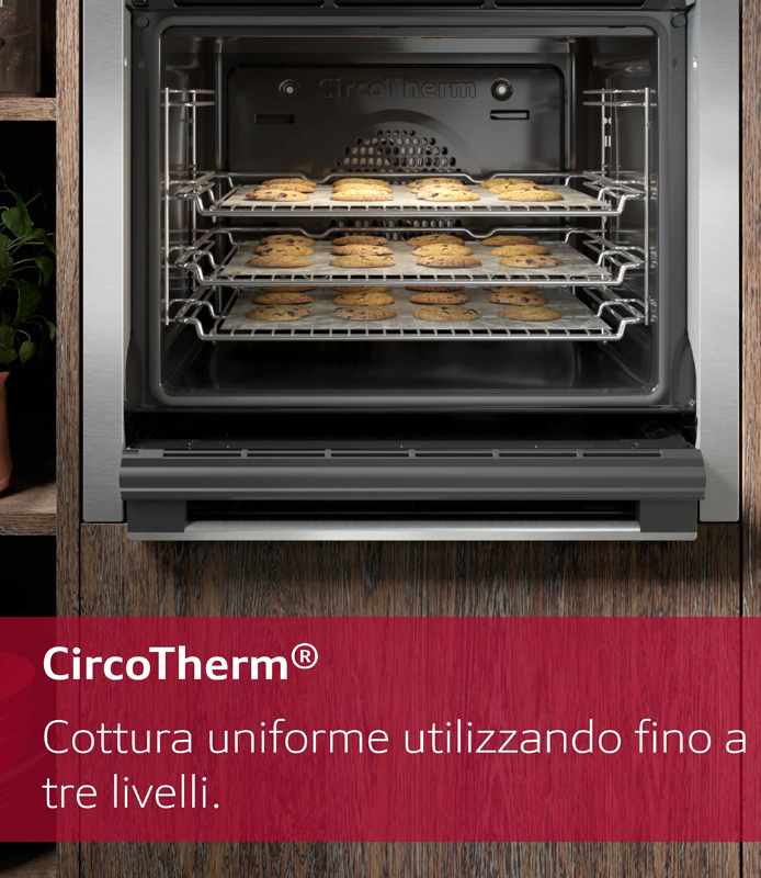 Se vuoi cuocere tre teglie su tre livelli contemporaneamente, adesso puoi farlo, con CircoTherm®. Il flusso d’aria calda ad alta velocità della ventola distribuisce il calore in modo uniforme in tutto il forno cuocendo ogni piatto con cura, così puoi dedicare più tempo a intrattenere i tuoi ospiti o a pianificare la tua prossima prelibatezza.