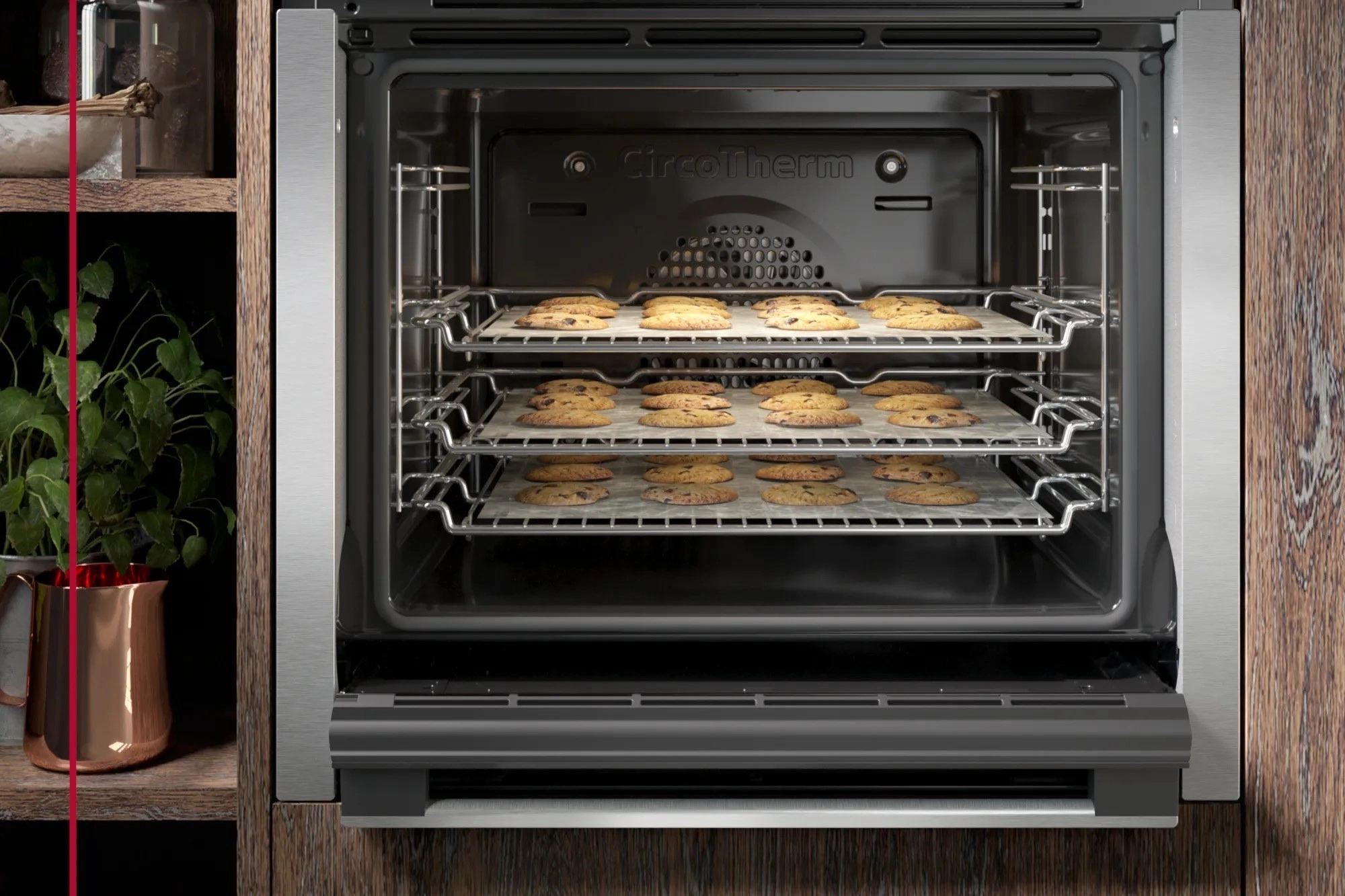 Se vuoi cuocere tre teglie su tre livelli contemporaneamente, adesso puoi farlo, con CircoTherm®. Il flusso d’aria calda ad alta velocità della ventola distribuisce il calore in modo uniforme in tutto il forno cuocendo ogni piatto con cura, così puoi dedicare più tempo a intrattenere i tuoi ospiti o a pianificare la tua prossima prelibatezza.