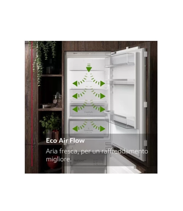 - Eco Air Flow: il sistema distribuisce l’aria nel vano frigo in modo omogeneo, creando condizioni ideali per la conservazione dei tuoi cibi.
