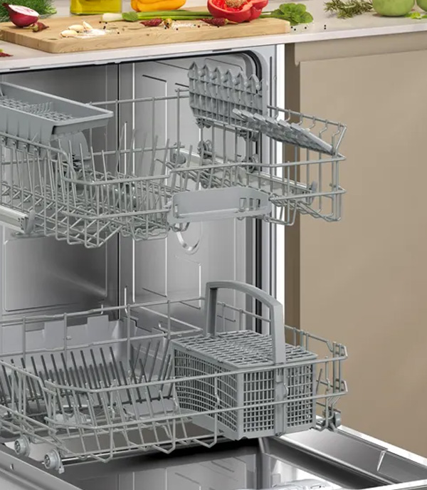 Una particolare caratteristica delle lavastoviglie NEFF è la flessibilità dei cestelli: più sono flessibili, più è possibile utilizzare lo spazio disponibile in modo efficiente. Dei tappini rossi evidenziano le parti che si possono adattare e, in base al loro numero, varia anche il livello di flessibilità misurato su 3 livelli. Le lavastoviglie con cestelli FLEX 1 hanno griglie che possono essere abbassate, alzate o spostate in base al carico sia del cestello inferiore, sia del cestello superiore.